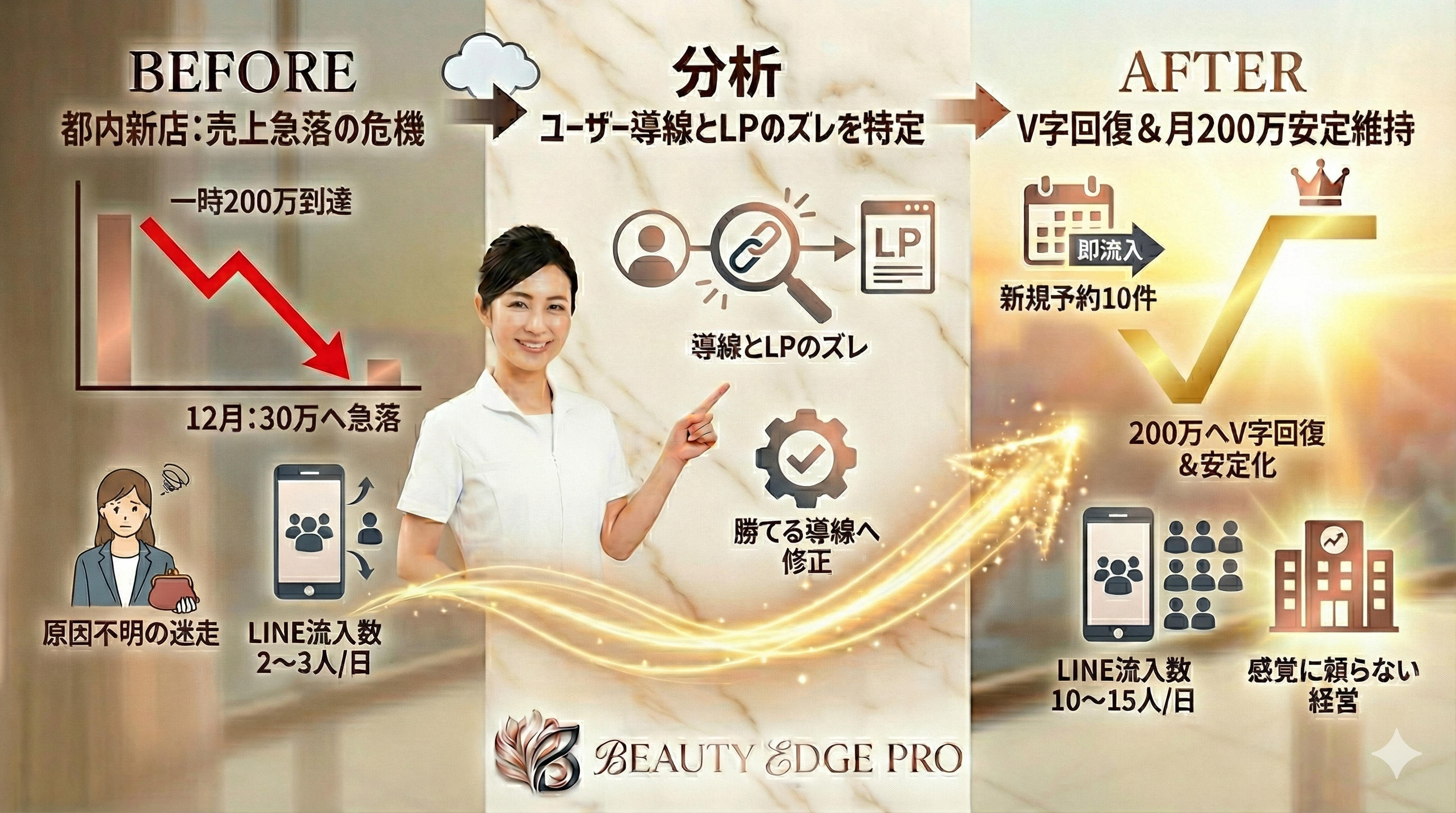 Before:技術はあるが「壁」にぶつかっていた時代、整体院として運営悩み・売上の限界(天井)を感じ、これ以上の拡大が見込めない状態だった。美容系施術へシフトしたものの、集客の「入り口」が定まらず、新規客数が毎月乱高下。どこにボトルネックがあるのか不透明なまま運用。