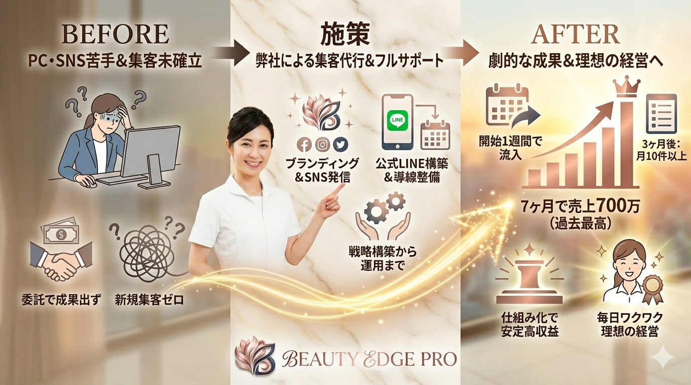 結果:感覚に頼らない「勝てる導線」への修正により、短期間でサロン経営を劇的に安定化させた実例です。